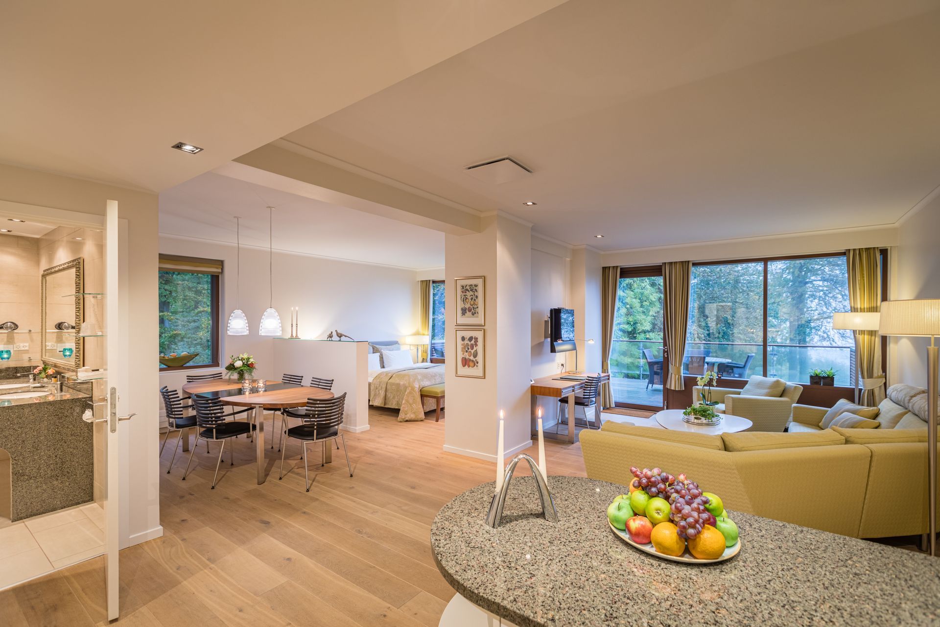 De to suiter er indrettet med et stort tekøkken med tilhørende minibar, kaffemaskine og tefaciliteter samt spiseområde med stort spisebord. Indretningen er i åben køkken-alrum-stil med et rummeligt opholdsrum, TV, god skabsplads og skrivebord med plads til fordybelse.